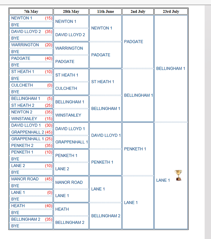 Here is the finalised draw taken from the WDLTA website. Lane Tennis Club have 2 teams in this competition.
